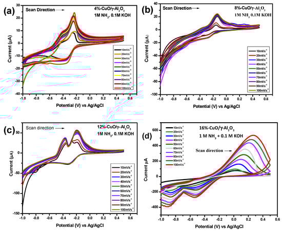 Electrocatalytic responses of all CuO/γ-Al2O3 materials towards ammonia electro-oxidation (AEO) was investigated by cyclic voltammetry in 1.0 M NH3 and 0.1 M KOH as displayed in Figure 6c,d. The peaks observed in both the forward (anodic) and reverse (cathodic) scans correspond to oxidative and reductive removal of chemisorbed species of ammonia, respectively [62]. The height of the anodic peak represents the electro-oxidation of ammonia on the surface of the electrodes. The anodic peak current increases with CuO contents in CuO/γ-Al2O3 nanomaterials; however, 16%-CuO/γ-Al2O3 shows the best performance towards AEO compared to other serial materials (Figure 6c), bare CuO and γ-Al2O3 (Figure 6d). The onset potential for AEO is found to be about −0.35 V vs. Ag/AgCl (i.e., −0.2 V vs. NHE) which is comparable to the Pt electrode [5,63,64,65].