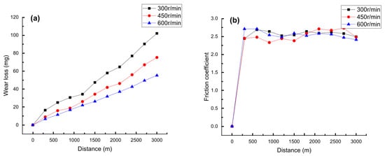 Figure 5 shows the variation of the wear loss and friction coefficients of various speeds under the same conditions, which were a normal load of 5 N, soil type of loam and soil moisture of 0. Figure 5a shows that the wear loss increased linearly with the sliding distance and the wear loss increased with the decrease in speed. Because the experimental distance is constant, the faster the speed is, the shorter the experimental time is. Therefore, the experimental time and the contact time of the wear test is longest when the rotational speed is 300 r/min and shortest when the rotational speed is 600 r/min. As can be seen in Figure 5a, the wear loss at 300 r/min is nearly worth two times at 600 r/min. Therefore, the conclusion can be obtained from Figure 5a that the wear loss is inversely proportional to the speed at the same sliding distance of 3000 m. Figure 5b shows that the friction coefficient of the three speeds is not very different, and fluctuates around 2.5. This indicates that the change of speed has little effect on the friction coefficient.