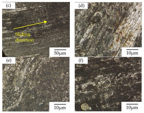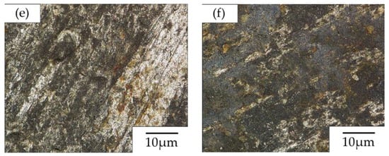 Figure 10 shows the micro morphologies of the worn surfaces of the pin at different moistures. The experiment was performed under a sliding distance of 3000 m, a rotating speed of 300 r/min, a soil type of loam and normal load of 5 N. Figure 10a shows that the surface of the pin is marked by oxidation wear, abrasive wear and adhesive wear. In addition to the common abrasive wear, oxidative wear and adhesive wear, Figure 10d shows red-brown rust and light-yellow material on the surface of the pin. Some of the substances in the soil react with the pin at high temperatures, resulting in the formation of red-brown iron oxide locally. A yellow substance is formed by the embedding of soil to the wear surface during the transfer of materials at high temperatures. When the soil moisture is 10%, the presence of moisture in the soil reduces the average temperature of the worn surface and the wear mechanism is dominated by abrasive wear (shown in Figure 10b,e). When the soil moisture is increased to 20%, there is more water in the soil. Some substances in the soil dissolved in water and acted as a lubricant in the wear test, thus making the friction coefficient relatively small (Figure 6b). Some substance in the water solution reacted with the pin surface, which caused corrosion wear, making the surface of the pin darker (shown in Figure 10c,f). The hardness of dry soil is relatively high. During the wear test, the soil between the pin and the disc made the contact surface fluctuate and the flash temperature is relatively high. On the contrary, the contact surface is relatively stable when tested in wet soil. Therefore, the surface damage of the pin is serious when the soil moisture is 0, but the wear loss is much less than the soil moisture at 10% and 20% (Figure 6a).