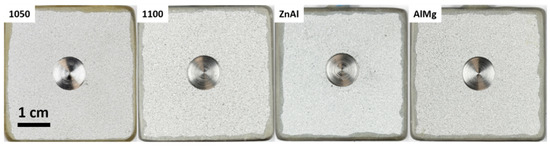 Figure 6 shows photographs of TS-coated samples after exposure to controlled laboratory tests with artificial seawater for 50 days. Here, it can be observed how the sample sprayed with the ZnAl alloy presents the more prominent coating color change and largest amount of white deposits on top of it. This is attributed to the formation of the Zn oxides/hydroxides/chlorides [12,27].