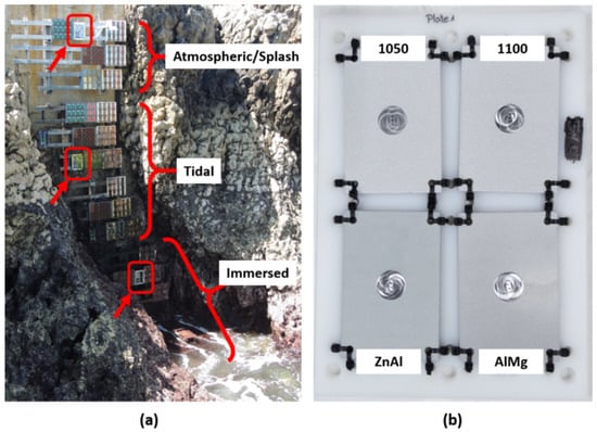 (a) Marine corrosion test site El Bocal (Santander, Spain), pointing out the location of TS (thermal spray) samples. (b) TS samples before exposure at El Bocal.