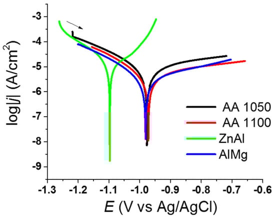 Initial characterization of the materials was carried out by potentiodynamic polarization. Figure 4 shows the polarization curves of the four samples recorded in artificial seawater after 24 h of immersion, and Table 4 shows the corrosion parameters obtained from these. Here, Tafel slopes were converted to Tafel coefficients (ba,c = ln(10)/βa,c) for comparison with the literature data. Corrosion potential (Ecorr) values of AA1050, AA1100 and AlMg are all within the range of −0.97 ± 0.01 V, whereas Ecorr of ZnAl alloy decreases to −1.10 V due to the higher nobility of aluminum than that of zinc. These are all mixed potential values due to the presence of defects on all coatings. When steel is exposed to seawater, a cathodic reaction, Equation (2), happens mainly on its surface while an anodic reaction happens on the coatings, Equations (3) and (4):