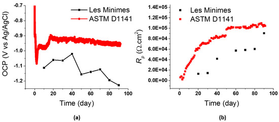 Electrochemical monitoring of samples exposed for 50 days in the laboratory was carried out by Open Circuit Potential (OCP) and Linear Polarization Resistance (LPR) measurements every 24 h. LPR scans were performed in the range of ± 15 mV from Ecorr, with a 10 mV·min−1 scan rate. Short-term tests such as polarization curves were repeated twice for reproducibility, while long-term tests were carried out once due to limited resources.