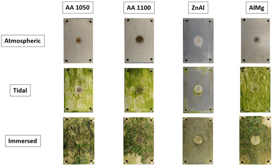 Thermal spray-coated samples with four Al/Zn alloys were exposed to three different zones of marine environments at the Marine Corrosion Test Site “El Bocal” in Santander (Spain): Atmospheric/splash, tidal and immersed, as shown in Figure 3. The total exposure period was 6 months and evolution of samples over time was carried out by periodic photographs. Figure 11 shows the images of the four alloys tested in atmospheric, tidal and immersed conditions at the end of the tests. Initial analysis of the corrosion performance of the coatings was based on appearance, looking into TS coating deposits (oxides, hydroxides of Zn or Al), biofouling, rusting and calcareous deposits. Overall blistering, additional damage or rust was not observed on top of the TS coatings tested. The alloys with Al as the main constituent do not present significant changes in terms of coating appearance or deposits over the 6-month exposure period. For the ZnAl alloy however, the coating appearance presents changes in color as exposure time increases and corrosion deposits on top of the coatings are visible on samples in atmospheric and tidal conditions. In all cases, biofouling on exposed samples increases from the atmospheric to the immersed zones, with the ZnAl alloy showing the least amount.