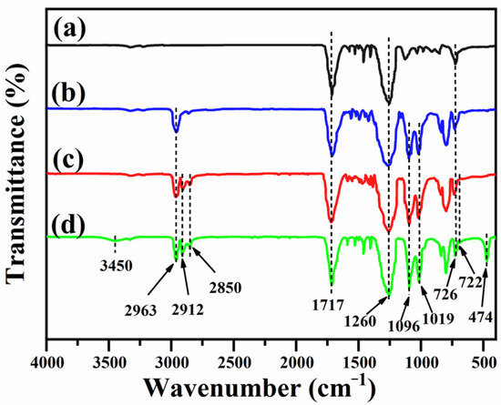The FTIR spectra of pristine, PDMS-coated, PDMS/STA-coated, and PDMS/STA/SiO2-coated fabrics are shown in Figure 1. Absorption peaks at 1717, 1260, and 726 cm−1 are characterized as the polyester fabric [36] and appeared in pristine (Figure 1a) and other fabric samples (Figure 1b–d). It is worth noting that some new peaks appeared in the spectrum of the PDMS/STA/SiO2-coated fabric (Figure 1d). The new absorption peak at 2963 cm−1 belonged to the bending vibration of Si–CH3 and those at 1096 and 1019 cm−1 were related to the stretching vibration of Si–O–Si from PDMS [37], which also appeared in the PDMS-coated fabric (Figure 1b). The results indicate that PDMS was successfully coated on the surface of the fabric. Peaks at 2912 and 2850 cm−1 were ascribed to the –CH2 and –CH3 groups of STA, and the peak at 722 cm−1 appertained to characteristic absorbance from the long chains of –(CH2)n–(n ≥ 4) in the long alkyl chain of STA [38,39], which is consistent with the PDMS/STA-coated fabric (Figure 1c) and indicates that the surface of the fabric was coated with STA successfully. The newly appeared absorption band and bending vibration absorption peak at 3450 cm−1 and 474 cm−1 belonged to the Si–OH bond and the Si–O–Si bond in SiO2, respectively [40,41], which proves that the PDMS/STA/SiO2-coated fabric was obtained.