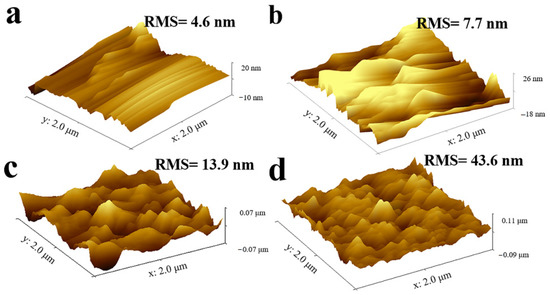 The surface topographies and the root-mean-square roughness (RMS) of the pristine, PDMS-coated, PDMS/STA-coated, and PDMS/STA/SiO2-coated fabric samples were analyzed by AFM (Figure 3). AFM is an effective tool to characterize roughness and the RMS value represents more significant roughness. It can be observed that the fiber of the pristine fabric was relatively smooth, and the RMS was only 4.6 nm (Figure 3a). After only being treated with the PDMS, the RMS was 7.7 nm (Figure 3b). With the addition of STA, the fluctuation of the fabric surface increased slightly and the RMS increased to 13.9 nm (Figure 3c). Figure 3d shows the AFM of the PDMS/STA/SiO2-coated fabric samples. With the addition of nano-SiO2, the RMS increased to 43.6 nm. This result indicates that immobilized nano-SiO2 on the fabric surface can greatly improve the surface roughness. The surface topography information obtained from the AFM images is consistent with the SEM characterization.