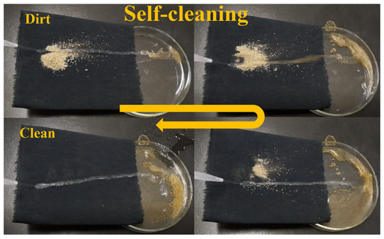 The pristine fabric has a commonly known weakness of easy contamination, whereas the PDMS/STA/SiO2-coated fabric possesses good self-cleaning performance for the easy removal of dust, as demonstrated in Figure 5. Water drops were rolled to completely clean up the dust scattered on the surface of the PDMS/STA/SiO2-coated fabric, which finally became clean (Supplementary Materials Video S1), demonstrating that the PDMS/STA/SiO2-coated fabric has an excellent self-cleaning property.