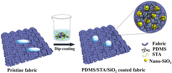 The superhydrophobic property can be realized by using materials with low surface energies and by constructing an appropriate surface roughness with hierarchical micro/nano-structures. Scheme 1 presents the process of preparing the superhydrophobic PDMS/STA/SiO2-coated fabric. The washed fabric was used as a self-supported substrate to gain an evenly distributed PDMS/STA/SiO2-coated fabric in a facile dipping coating process using the EA solution mixed with PDMS, STA and nano-SiO2, among which the PDMS served as a hydrophobic agent and an adhesive layer, the long alkyl chains from the STA provided low surface energy, and the nano-SiO2 offered nanoscale roughness.