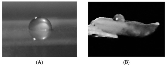 Drops of either solution (FFS and FFS + TG) were deposited on a glass microscope cover slip (Figure 1A) or on the internal surface of peanut cotyledons (Figure 1B), utilizing a microfluidic pump to keep the deposited volume constant at 8 µL. Photos were taken using a Cannon Rebel T3 (12 MP color), with a lens EF-S 18–55 mm f/3.5–5.6. The camera was positioned in such a way that the drop and its reflection on the cover slip were observed. This view facilitated the identification of the solid–liquid–air interfaces.
