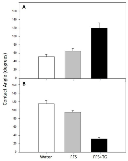 A good wettability of solid surfaces and consequently a homogeneous coating can be obtained when the contact angle of a coating solution applied on the surface to be coated is lowest. As seen in Figure 2B, the lowest contact angle on the peanut surface was obtained with FFS + TG. These results are in agreement with the increase of hydrophobic properties of FFS + TG, which increased its compatibility with the hydrophobic surface of peanuts, improving the adhesivity of the coating to the peanut surface and making a homogeneous coating surface.