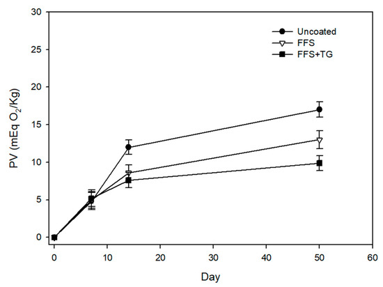 Peroxide value (PV) of uncoated and coated peanuts with FFS or FFS+TG during 50 days of storage. N = 6, values shown are mean ± standard deviation.