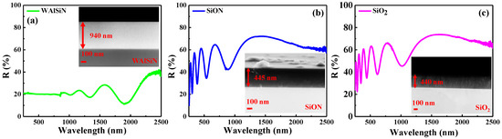 Reflectance spectra of individual layers deposited on stainless steel (SS) substrate (a) WAlSiN, (b) SiON, and (c) SiO2. The cross-sectional FESEM images of the individual layers are shown in the insets.