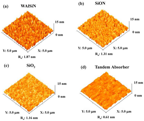 where Rr, Rp, σ and λ are reflectance of rough surface, reflectance of polished surfaces, root mean square roughness and wavelength, respectively. According to Kirchhoff’s law, the emissivity and reflectance can be related using the following equation: ελ = 1−Rλ [34,35]. From the above two equations it is evident that with increasing surface roughness, the emissivity of the film increases [7]. However, a fine nanostructure formed on the coating surface will enhance the light absorption by multiple reflections due to light trapping [36]. Cao et al. numerically investigated the dependence of surface roughness of the film on the reflectance and thermal emissivity [37]. Similarly, Wen et al. reported the modelling of surface roughness of aluminum alloy by different theoretical models and results indicate a clear correlation between the surface roughness and thermal emissivity [38]. Recently, metal–liquid–crystal–metal (MLCM) based metasurface of Au/LC/Au are reported for their enhanced thermal camouflage by structuring the surface emissivity and optimizing the surface microstructure [39,40]. In this regard, we carried out AFM studies to evaluate the effect on optical properties based on surface roughness of individual layers and multilayer stack, as shown in Figure 2. The main absorber layer (WAlSiN, layer thickness ~940 nm) exhibited the average roughness (Ra) of 1.87 nm, as shown in Figure 2a and the layer exhibits a selectivity (α/ε) of 0.80/0.63. However, SiON and SiO2 depicted low average roughness values of 1.31 and 1.16 nm, as shown in Figure 2b,c. The anti-reflection layers exhibit almost similar selectivity of 0.440/0.20 and 0.428/0.20 for SiON (layer thickness ~445 nm) and SiO2 (layer thickness ~400 nm), respectively. The multilayer stack of W/WAlSiN/SiON/SiO2 deposited on SS substrates depicts a low surface roughness of 0.61 nm and exhibits good spectral selectivity (α/ε) of 0.955/0.10. The results indicate that the surface roughness of the thin films influences the thermal emissivity of the coatings.