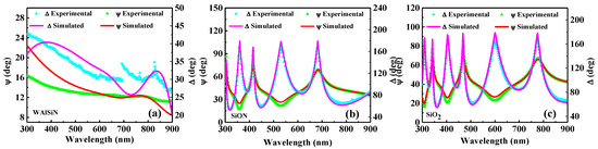 Ellipsometry spectra of individual layers, (a) WAlSiN, (b) SiON, and (c) SiO2 deposited on SS substrate.