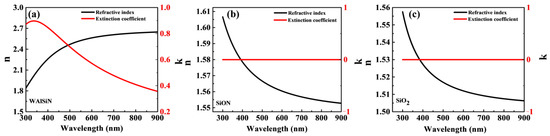 Refractive indices and extinction coefficients of individual layers (a) WAlSiN, (b) SiON, and (c) SiO2 deposited on SS substrate.
