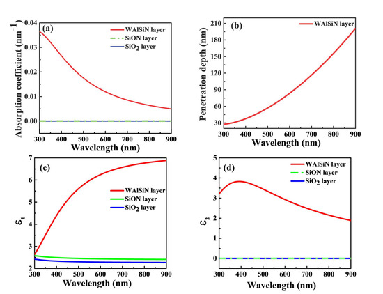 where, N and ε are complex refractive index and complex dielectric constant, respectively. Similarly, the real and imaginary part of dielectric constant can be calculated using ε1 = n2 − k2 and ε2 = 2nk, respectively [41]. The real (ε1) and imaginary (ε2) part of dielectric constants of individual layers were plotted using the obtained optical constants (n and k), which are shown in Figure 5c,d. The imaginary part (ε2) of dielectric constant is related to the conductivity of the material and higher (ε2) indicates good conductivity due to metallic nature of the film. The ε1 is related to the polarization and ε2 is related to dissipation, which accounts for wide-angle selectivity and better absorption in the film, respectively. The ε2 for WAlSiN layers increases with wavelength, depicting excellent absorption property of the film. However, SiON and SiO2 demonstrate no absorption and are highly transparent films in the wavelength range [47,48].