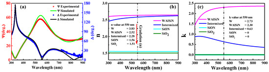 (a) Ellipsometry spectra of solar absorber coating, (b) refractive index and (c) extinction coefficient of WAlSiN/SiON/SiO2 multilayer stack deposited on SS substrate. The refractive index and extinction coefficient of W are depicted in (b) and (c).