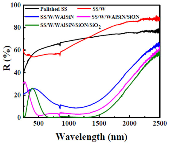 To understand the behavior of high solar absorptance of the multilayer stack, we have deposited successive layers step by step (SS, SS/W, SS/W/WAlSiN, SS/W/WAlSiN/SiON, and SS/W/WAlSiN/SiON/SiO2) and measured the reflectance spectra of each sample. From the reflectance spectra it clear that by addition of one more layer on the top, the reflectance in the UV-Vis region reduces and near-zero reflectance is achieved after deposition of last layer, as shown in Figure 7. We have measured the reflectance of polished SS substrate as a reference of reflectance for characterization of layers deposited on it successively and the optical properties (α and ε) are tabulated in Table 1. The deposition of the WAlSiN layer with fine-nano multilayers over the W interlayer results in a significant drop of reflectance in the UV-Vis region due to interference, as seen in Figure 7. Further, adding of SiON and SiO2 anti-reflection layers the reflectance to near zero in the wavelength range of 500–1300 nm is achieved due to gradation in refractive indices of the layers as shown in Figure 6 [56].