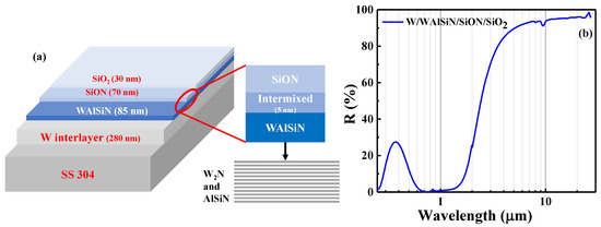 The schematic representation of the multilayer tandem stack of W/WAlSiN/SiON/SiO2 deposited on the SS substrate, as shown in Figure 8a. The schematic depicts an intermixed layer between WAlSiN and SiON layer, a detailed explanation of this is mentioned in the below section. The thicknesses of each individual layers in the multilayer stack are labelled in the schematic, as depicted in Figure 8a. The selective solar absorber coating is designed based on a graded refractive index with a double anti-reflection layer. The reflectance spectra of the multilayer stack are as shown in Figure 8b, exhibits near-zero reflectance in the wavelength range of 0.6–1.4 µm and high reflectance of above 90% in the infrared region [28]. The low reflectance and high absorptance in the multilayer stack is due to destructive interference and band-to-band transitions [3]. A graded design of a multilayer stack generates a step-by-step change in the refractive index, resulting in lower reflection due to interference effect. Additionally, the double anti-reflection layer (DLAR) of SiON/SiO2 reduces the reflection losses at the surface and enhances the absorption by trapping the incident solar radiation [10,32,57]. Kim et al. reported the DLAR coatings of SiNx/SiO2 of different thicknesses and the refractive indices of each layer were theoretically calculated using Essential Macleod software. They also reported that DLAR coatings exhibited better solar efficiency when compared to single SiNx anti-reflection layer [10]. Moreover, the absorption of light over a wide range of wavelength is achieved better in DLAR than a single ARC layer [58]. In summary, we have demonstrated that the gradient in the refractive index of the individual layers in the multilayer stack responsible for the enhanced absorption (high α).