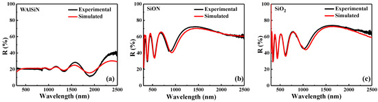 Experimental reflectance spectra of the individual layers in the tandem stack fitted with the simulated spectra obtained from SCOUT simulation software (a) WAlSiN, (b) SiON, and (c) SiO2 layer.