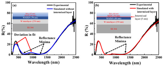 The multilayer reflectance spectra of the solar absorber fitted with simulated spectra generated from simulation: (a) Without the intermixed layer and (b) with the intermixed layer. The schematics of the multi-layer stack with simulated layer thicknesses are presented as insets.