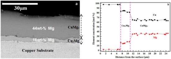 XRD analysis identified the existence of two distinct phases corresponding to the Cu2Mg and to the CuMg2 (Figure 1c). Combining these results with those of the EDS analysis, it is concluded that the inner layer is Cu2Mg and the outmost layer is the CuMg2 phase. This layer topography is also confirmed from the results of Ref. [24], in which it was found that for very short deposition time (30 min) the coating had one single layer corresponding to Cu2Mg; for longer holding times, the CuMg2 phase appeared over Cu2Mg. The formation of these phases is the result of a two-step chemical procedure. In the beginning, Mg diffuses in the copper substrate which results to the formation of the MgCu2 phase. The MgCu2 increases as Mg diffusion continues through the Cu2Mg. Moreover, some of the Mg ions do not reach the copper substrate but enrich the upper areas of the Cu2Mg phase and transform it to CuMg2. The rate of the formation of CuMg2 increases as the thickness of the MgCu2 grows, because the Mg ions have to traverse a bigger distance to reach Cu. After a particular point, the formation of extra MgCu2 amounts is insignificant and that is the reason the CuMg2 layer has bigger thickness than the inner Cu2Mg layer.