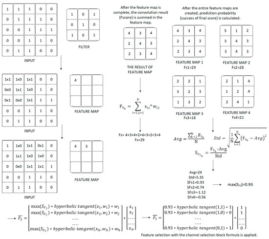In Equation (1), x is the output feature of network, w represents the convolution’s kernel and P is the set of pixel positions. The standard deviation value gives the distribution of all available scores. The main thing is to calculate how many times below or above the standard deviation from the average score by using the standard deviation value and scores. As a result of this thought, the relative position of each score to all scores can be expressed mathematically. Following, these scores can be compared with each other. The absolute grade of the final score is a function of the absolute grade average of all final scores and a standard deviation. The function gives the success of this final score (Equation (2)). In these equations, K is the number of channels and is the success of final score.