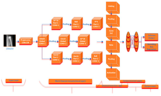 The proposed multichannel CNN model has a three-channel convolution layer. After the images are preprocessed, the model starts with the global convolution layer. It is designed as three channels in total, with this layer feeding two different convolution layers. There are three convolution layers, two pooling layers, an ReLU linear unit and fully connected layer in these layers. While it has a 64 × 64 × 3 convolution core in the first convolution layer in the global channel; it has 32 × 32 convolution cores in the second convolution layer and 16 × 16 convolution cores in the last convolution layer. In the second convolution channel in the architecture, 16 × 16 convolution cores are in the first convolution layer, 8 × 8 convolution cores are in the second convolution layer, and 4 × 4 convolution core is in the last convolution layer. There are 32 × 32 and 16 × 16 convolution cores in the first two convolution layers of the third convolution channel, and 8 × 8 convolution cores in the last convolution layer. The fully connected layer of the global convolution channel produces 500 size output, while the full connected layer of the other two convolution channels produces 100 size output. Outputs from all channels are calculated over the channel selection layer in order to produce the best result of the proposed multichannel CNN architecture with the formulas given in Section 2.3. After these feature maps were linked to fully connected layers, Softmax and Bounding Box activation was performed to determine the classification possibilities. The proposed model is shown in Figure 5.