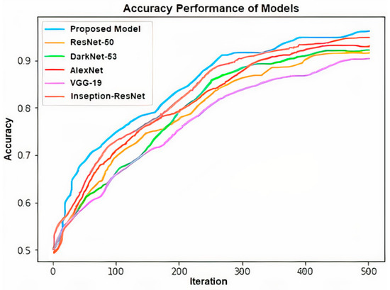 The accuracies of the models are, respectively: 97.2−96.31% for proposed model, 92.73−88.69% for ResNet-50, 93.85−90.95% for Dark-Net-53, 94.41−93.88% for AlexNet, 91.06−86.51% for VGG-19 and 95.53−93.13% for Inseption-ResNet (Table 1 and Table 2).