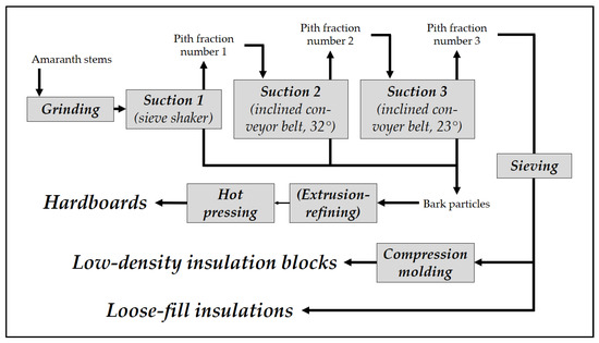 In Figure 1, a schematic diagram of the fractionation process of the amaranth stems, including their grinding and then their separation between bark and pith particles through three successive suction stages, is presented. This diagram also includes the building materials obtained from each of these two fractions and the equipment used to obtain them.