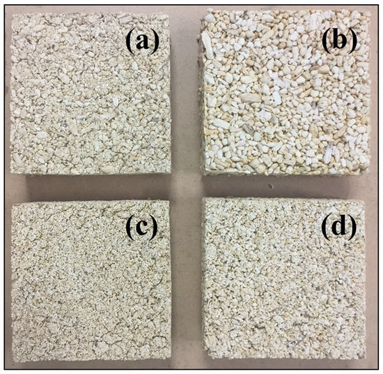(a) Photograph of the low-density insulation block made from the MP sieved fraction of pith particles; (b) Photograph of the low-density insulation block made from the BP sieved fraction of pith particles; (c) Photograph of the low-density insulation block made from the SP sieved fraction of pith particles; (d) Photograph of the low-density insulation block made from the mix of the SP, MP, and BP pith particles. All the insulation blocks have a 10% (w/w) starchy binder content.