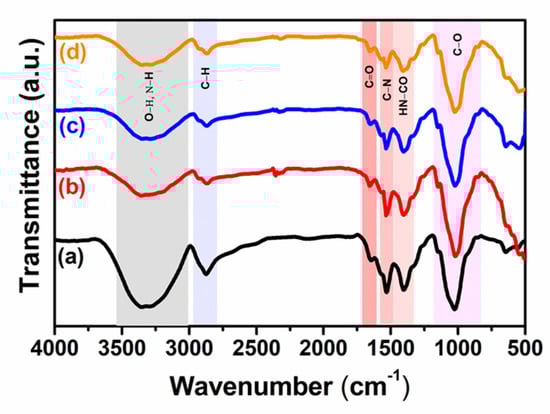 The ATR/FTIR analyses of (a) pCS, (b) pCS-0.4PBLO, (c) pCS-1PBLO, and (d) pCS-1.2PBLO.