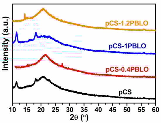 XRD analyses of pCS, pCS-0.4PBLO, pCS-1PBLO, and pCS-1.2PBLO.