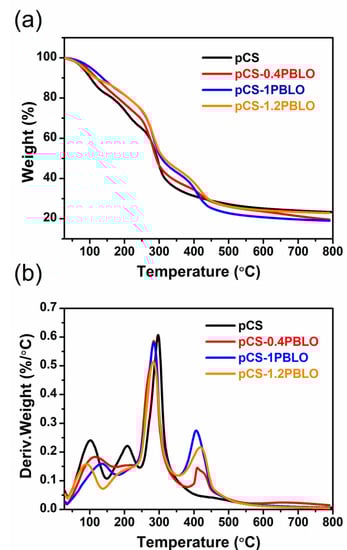 (a) TGA and (b) DTG profiles of pCS, pCS-0.4PBLO, pCS-1PBLO, and pCS-1.2PBLO.