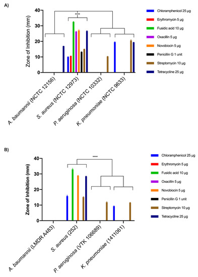 The antibiotic susceptibility of the susceptible and resistant bacterial strains was determined against common broad-spectrum antibiotics that demonstrate antimicrobial activity against both Gram-positive (Figure 1A,B) and Gram-negative (Figure 2A,B) bacteria. When the antibiotics commonly utilised against Gram-positive bacteria were tested, S. aureus was the most susceptible strain, with eight out of eight antibiotics inhibiting the growth of this strain (NCTC 12973), whilst five out of the eight antibiotics (chloramphenicol, fusidic acid, novobiocin, streptomycin and tetracycline) resulted in growth inhibition of the resistant strain (Strain 252). The greatest inhibition of growth observed was by 10 µg fusidic acid against the resistant strain (Strain 252), producing an average ZoI of 32.57 mm. The least affected bacterial species to the commonly utilised antibiotics against Gram-positive bacteria was A. baumannii with only tetracycline producing a ZoI (16.90 mm) against the susceptible strain (NCTC 12156).