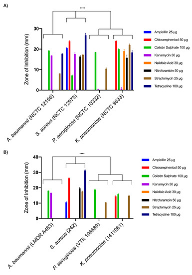 The MASTRING-S® antibiotics (M26/NCE) which are commonly utilised against urinary tract pathogens/Gram-negative bacteria were tested against the susceptible and resistant bacterial strains (Figure 2A,B). The growth of the susceptible strains, S. aureus (NCTC 12973) and K. pneumoniae (NCTC 9633) was the most affected with both exhibiting growth inhibition when tested against seven of the eight antibiotics. The largest ZoI (26.80 mm) was determined by 10 µg tetracycline against the susceptible S. aureus strain. The resistant bacterial strains demonstrated greater resistance profiles; five out of the eight antibiotics inhibited S. aureus (Strain 252) growth, whilst three of the eight inhibited K. pneumoniae (Strain 1411061). The antibiotic which demonstrated the greatest growth inhibition observed was 10 µg tetracycline (31.30 mm) produced against the resistant S. aureus (Strain 252). Overall, the most resistant strains utilised throughout this study were the resistant A. baumannii (LMDR A483) strain, with only two of the fourteen antibiotics inhibiting growth, and P. aeruginosa (VTK 106689) with only three antibiotics producing a ZoI. European Committee on Antimicrobial Susceptibility Testing (EUCAST) guidelines [33] were consulted to determine antimicrobial susceptibility (Electronic Supplementary Information, Table S1).