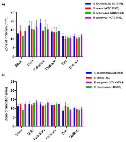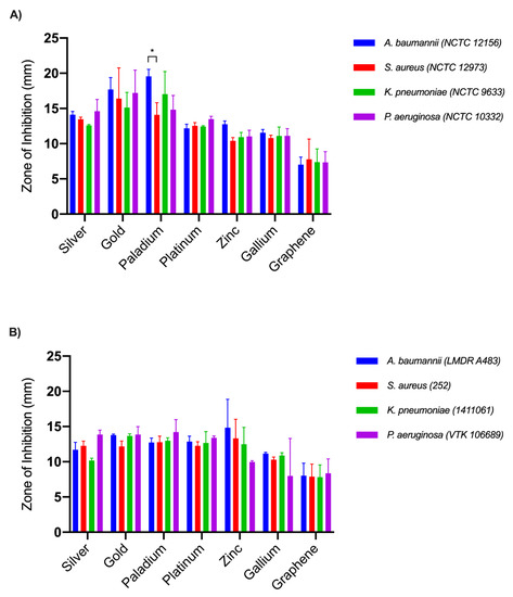 Overall, palladium and gold displayed the greatest antimicrobial efficacy against the eight susceptible and resistant isolates tested (Figure 3). Both metals were able to inhibit the growth of most of the isolates producing ZoIs in the range of 14.10–19.53 mm and 15.14–17.68 mm against the susceptible isolates, and 12.73 mm –14.21 mm and 12.17–13.877 mm against the resistant strains, with palladium and gold, respectively. Silver, zinc and platinum similarly showed, good antimicrobial activity against the majority of the isolates (Figure 3A,B). The degree of antimicrobial activity by the metals tested observed was greater against the susceptible bacterial strains when compared to the resistant strains. Gallium exhibited the least antimicrobial activity of the metals tested against the bacterial isolates tested (Figure 3A,B). Interestingly, on average the metals produced greater inhibition of growth against the susceptible bacterial strains. Graphene exhibited the least antimicrobial activity producing ZoIs in the range of 7.00–7.78 mm for the susceptible strains and 7.82 mm–8.36 mm for the resistant strains.