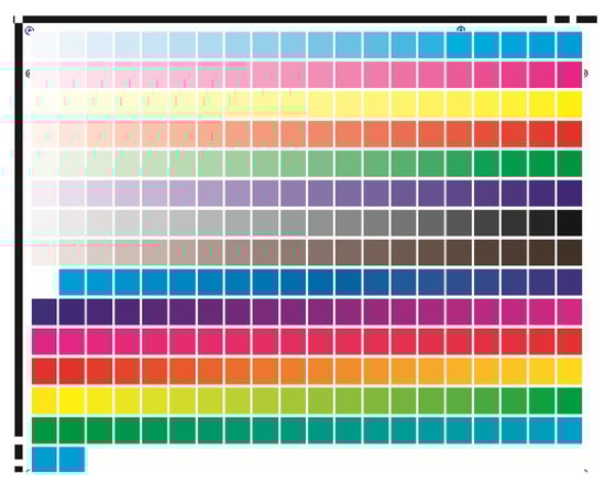 To determine the change in color characteristics of the prints on the linen fabrics, depending on the fabric structure and color, in different printing modes, the generated Barbieri Rasterlink color reproduction scales were printed on all fabrics (Figure 1).