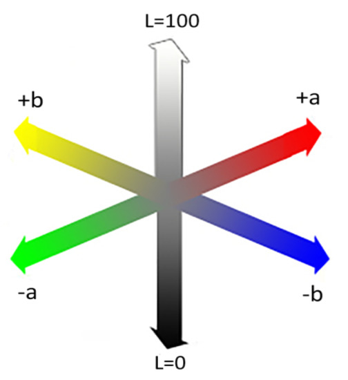 where L* is lightness value (0 for black and 100 for white); a*—position between red and green value (negative–green, positive–red); b*—position between blue and yellow value (negative–blue, positive–yellow) [24], Figure 2.