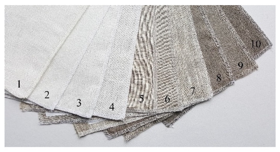 Ten linen fabrics from three different types were selected for the study: bleached, melange and natural linen [21]. The linen fabric was made of different threads in warp and weft directions. Warp threads are the yarns held in the loom during the weaving of the fabric and weft threads are the yarn that is passed through the weft yarns during the weaving of the fabric. The fabrics of each type differ in color, fabric density grammage, thickness and density of the threads (Table 1).