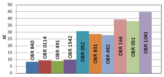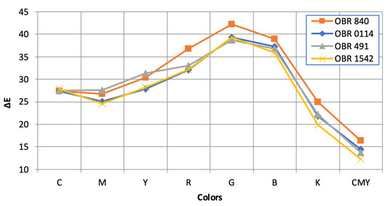 In the study of the application of the two dye layers on bleached fabrics (Figure 11), it was observed that the thickest OBR 1542 fabric has the smallest change in ΔE color characteristics. It was also observed that the thinnest linen OBR 840 reproduces red, green, blue, black and brown. Additionally, when printing with two coatings, the color reproduction is very good on OBR 0114, and the change in color characteristics is very similar to OBR 1542. The color characteristics ΔE values were found to be very similar for all bleached fabrics; the difference between them is not large (≤4).