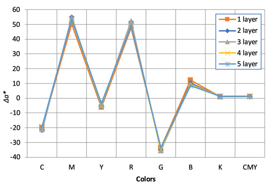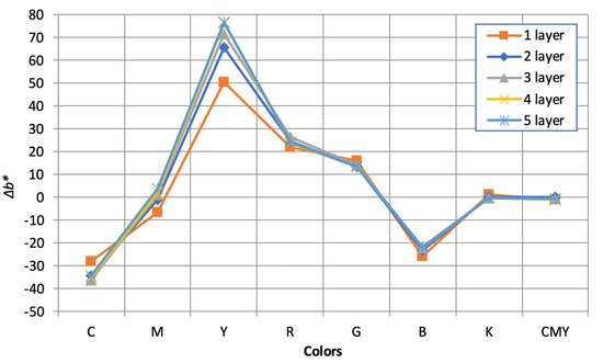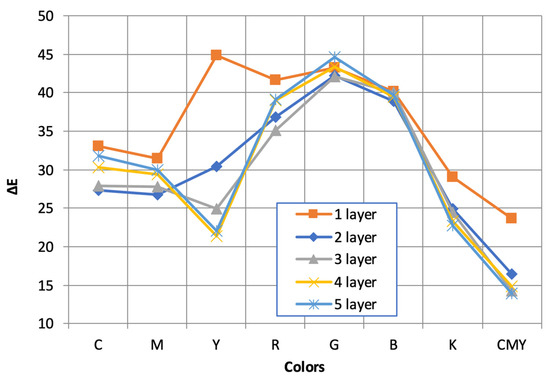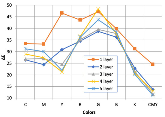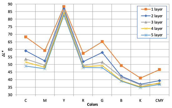 It was observed that the value of lightness (L*) changes the most in the overall color (Figure 8). It was found that, by changing the number of layers of ink to be coated, the cyan color lightness changes the most, changing from 48.99 for one-layer printing to 68.29 for five-layer printing; the brightness of green color lightness also differs quite strongly; the color darkens by as much as 26.5% when printed with five layers compared to one layer. Yellow is the least sensitive to the change in the number of paint layers (change is 6%). The most sensitive to the change in the number of paint layers are cyan (28% change) and green (26% change). Comparing the change in brightness of all the colors lightness analyzed in the diagram, it is clear that it changes the most when printing with two and three layers of ink, while when printing with an additional four and five layers, the change in lightness is insignificant (average change, 2–4%, respectively). It can also be seen that the differences in blue, black and CMY colors between layers 2, 3, 4 and 5 are very slight, and the difference between magenta, red and green is very small between layers 3, 4, 5.