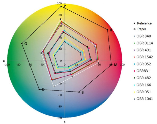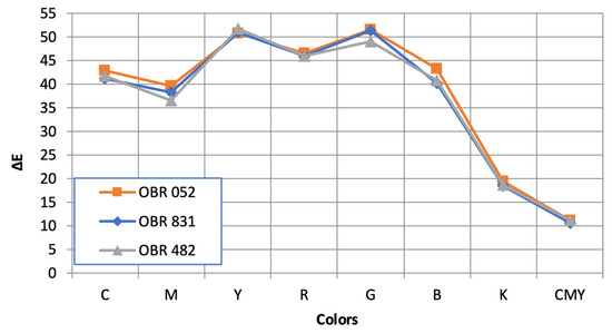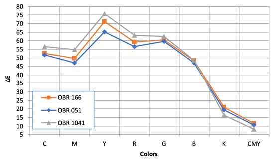 In the study of color reproduction on natural fabrics in the presence of two coats of paint (Figure 13), much larger changes in color characteristics were observed between different fabrics. The largest difference was observed in yellow. It was also observed that the colors are much better reproduced on the OBR 051 fabric, slightly worse on the OBR 166 fabric, and the largest difference was obtained on the thickest linen fabric of the OBR 1041, except for the dark colors.