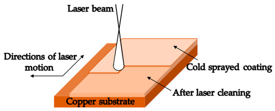 Cold spray was originally developed as an environmental coating technique for solid material deposition in the 1980s [9]. During this process, powder materials impact the substrate at an ultra-high speed and form a homogenous coating by plastic deformation. The whole process is conducted at near room temperature, thus it can fabricate versatile elements or alloy coatings with negligible oxidation [10,11]. Furthermore, due to the high speed of the powders, the coating presents uniform components and strong adhesion with substrates [12,13]. However, coatings deposited by cold spray may have some defects induced by severe plastic deformation, which will harm the electrical properties. Generally, post-treatments such as annealing are effective and economical ways to improve the electric performance of high-defect materials [14,15]. Furthermore, as a new surface modification technology, laser scanning shows the effects of both annealing and arraying the surface morphologies, which could possibly be used to improve the electric performance of the cold-spray coatings [16,17,18].