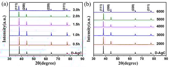 XRD patterns of the AgC coatings after (a) different annealing durations and (b) different laser scanning speeds.