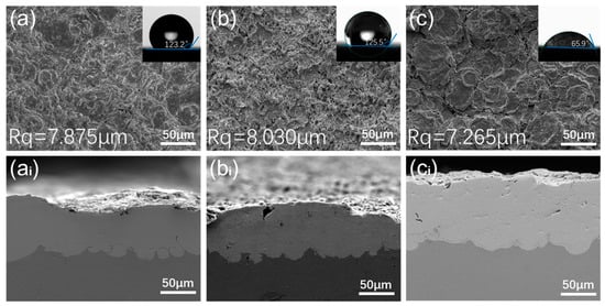 The surface and cross-sectional morphologies of the as-deposited and treated AgC coatings: (a,ai) for D-AgC, (b,bi) for L-AgC, (c,ci) for A-AgC, and the insets show the contact angles of each sample, respectively.