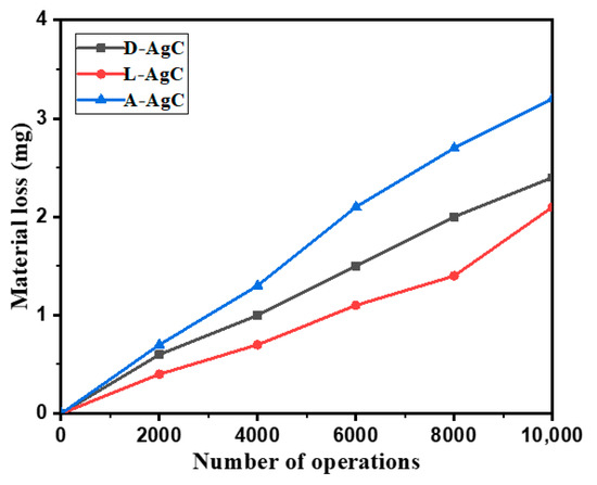 The mass changes of the D-AgC, A-AgC, and L-AgC samples with numbers of operations.