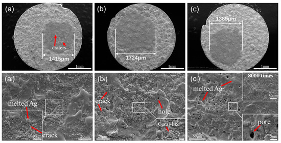 Surface morphologies of the three samples were also observed to reveal the mechanisms of different erosion rates behind. Figure 7 demonstrates the morphologies of the eroded surface for as-deposited AgC, annealed AgC and laser-scanned AgC electric contact after 10,000 switching operations. As shown in the low-magnification images in Figure 7a–c, the dark and bright areas are the eroded and non-eroded zones by the arc, respectively. Compared with the as-deposited AgC coating, the annealed coating exhibited a much larger erosion area with a diameter of 1724 μm, while the laser-scanned AgC coatings had a slightly smaller area with a diameter of 1389 μm. Even though the laser-scanned sample had a closer erosion diameter to the as-deposited sample of 1415 μm, the deeper crater-like pits on the surface of the as-deposited AgC coating signed by the red arrows meant more serious arc erosion.