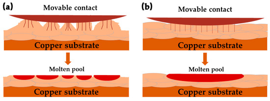 The discussion about the reason for the different arc erosion rates of these three kinds of AgC coatings is given below. There are many reasons leading to this result, which can be roughly concluded into two categories according to its characters. One is the different stress states, as original compressive stress can prevent the structure from loosening [25,26], which will reduce the erosion. The other category is the different surface morphologies that can change the character of the connection between the stationary and movable contacts [27,28]. Figure 8 shows the schematic image of the erosion process influenced by surface morphology. It meant that the electric current would be dispersed [29] when there were many micro-nano structures on the surface (Figure 8a), which would lead to the formation of many small and dispersive molten pools. In this condition, the evaporation and sputtering would reduce. On the contrary, the surface without micro-nano structures (shown in Figure 8b) would generate the larger concentrated molten pool during the erosion test, which would increase the evaporation and sputtering resulting in increased mass loss [30]. From the discussion, it could be concluded that the releasing of compressive stress and the surface without a special structure caused a worse erosion resistance than the as-deposited sample. Furthermore, the surface with the micro-nano structure might be the main reason that the erosion resistance of the sample was enhanced after laser scanning. However, the eroded mechanism of cold-sprayed and post-treated AgC coatings is complex and more studies are worthy to perform in the future.