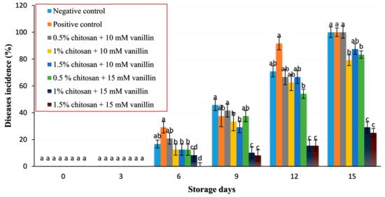 | 0.5% chitosan + 10 mM vanillin | 0.46 ab | 0.66 ab | 1.06 ab |